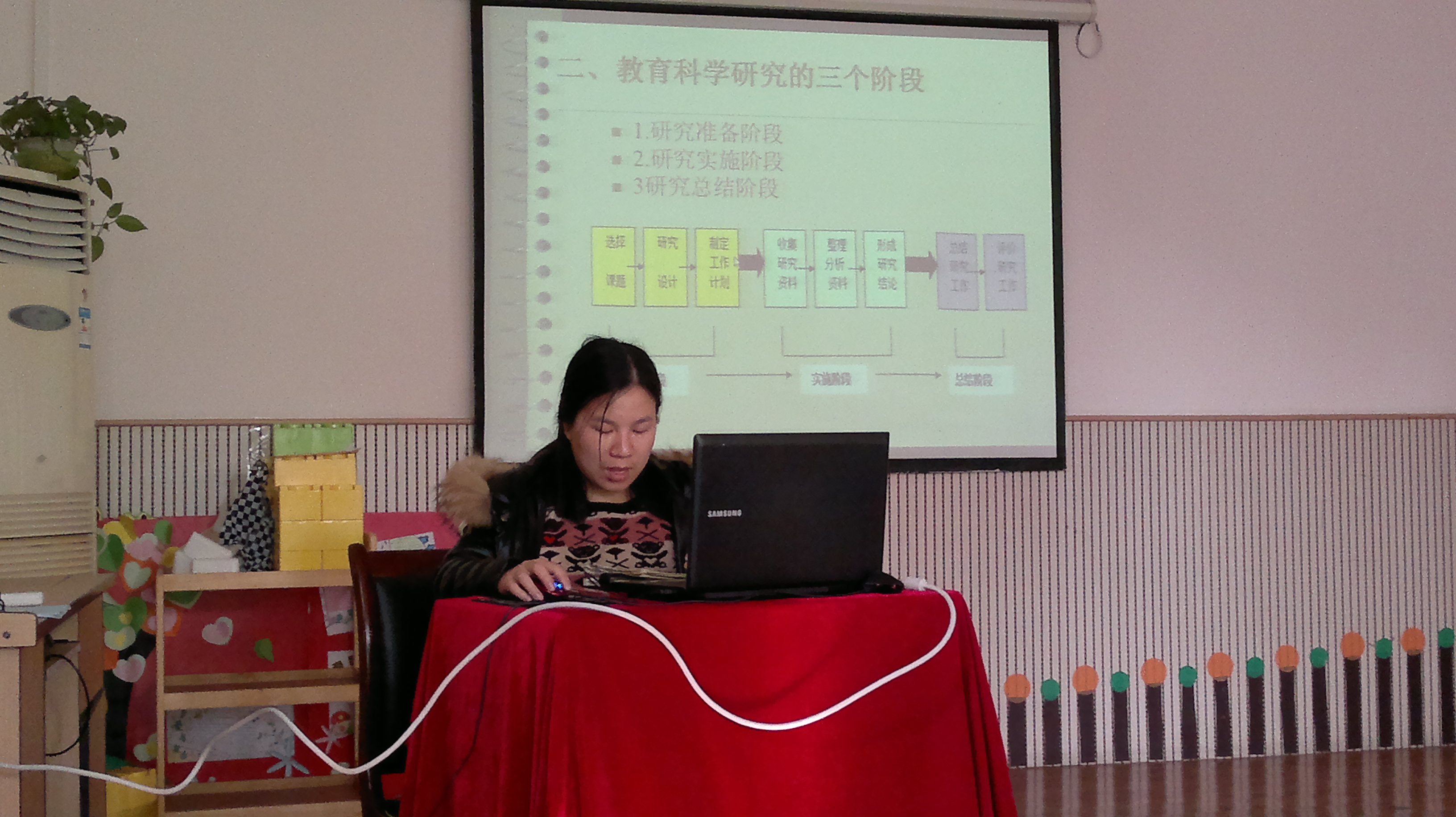 湘湖幼儿园2014年缪佳红老师对全体教师进行教科研培训活动照片