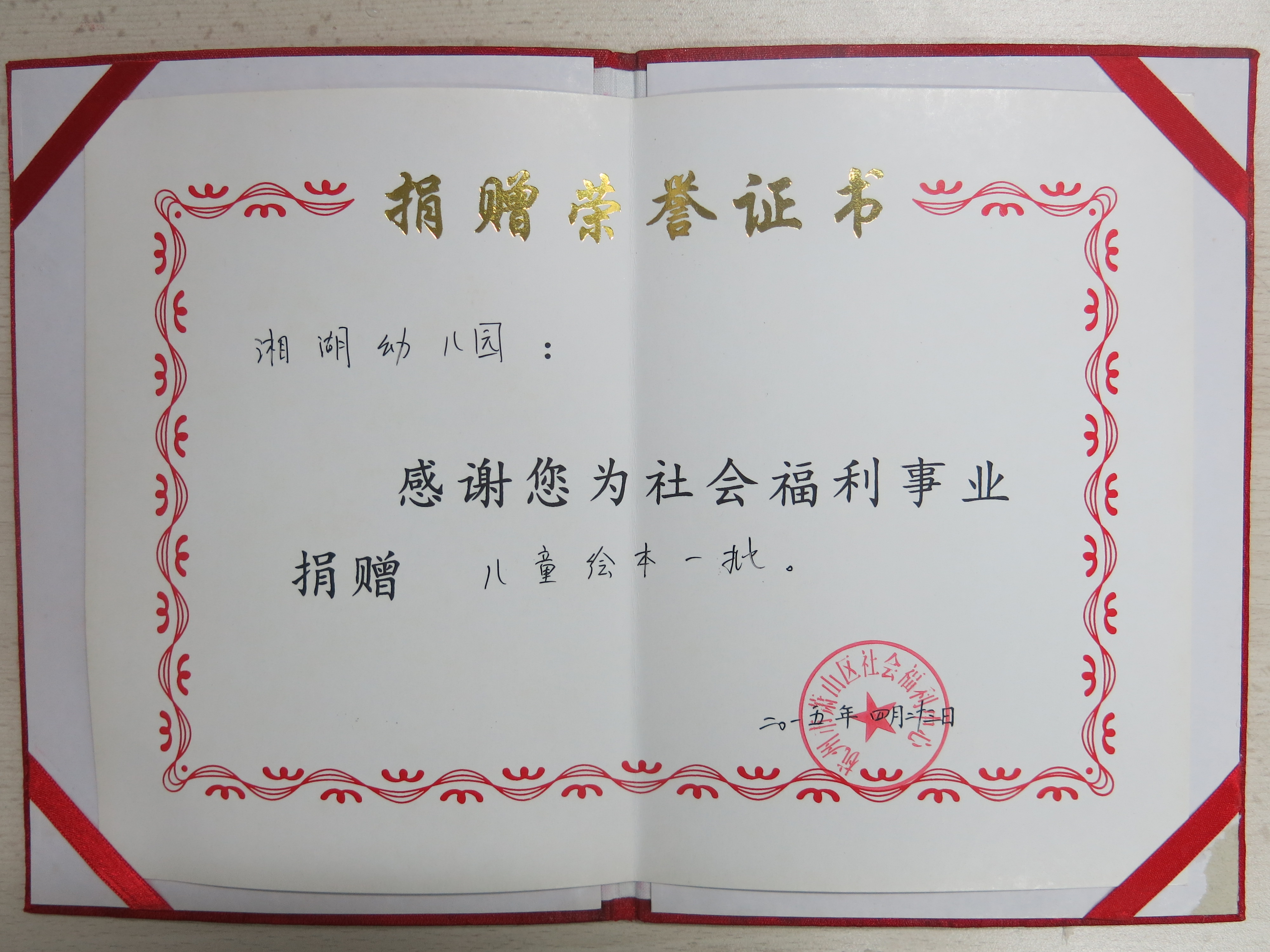 湘湖幼儿园2015年荣获萧山区社会福利中心捐赠荣誉证书