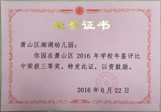 荣获萧山区2016年度学校年鉴评比三等奖荣誉证书
