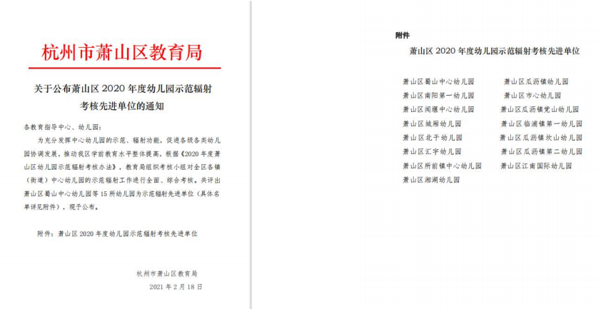 萧山区湘湖幼儿园被评为“萧山区2020年度幼儿园示范辐射考核先进单位”文件