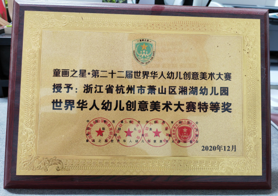 萧山区湘湖幼儿园2020世界华人幼儿创意美术大赛特等奖牌匾
