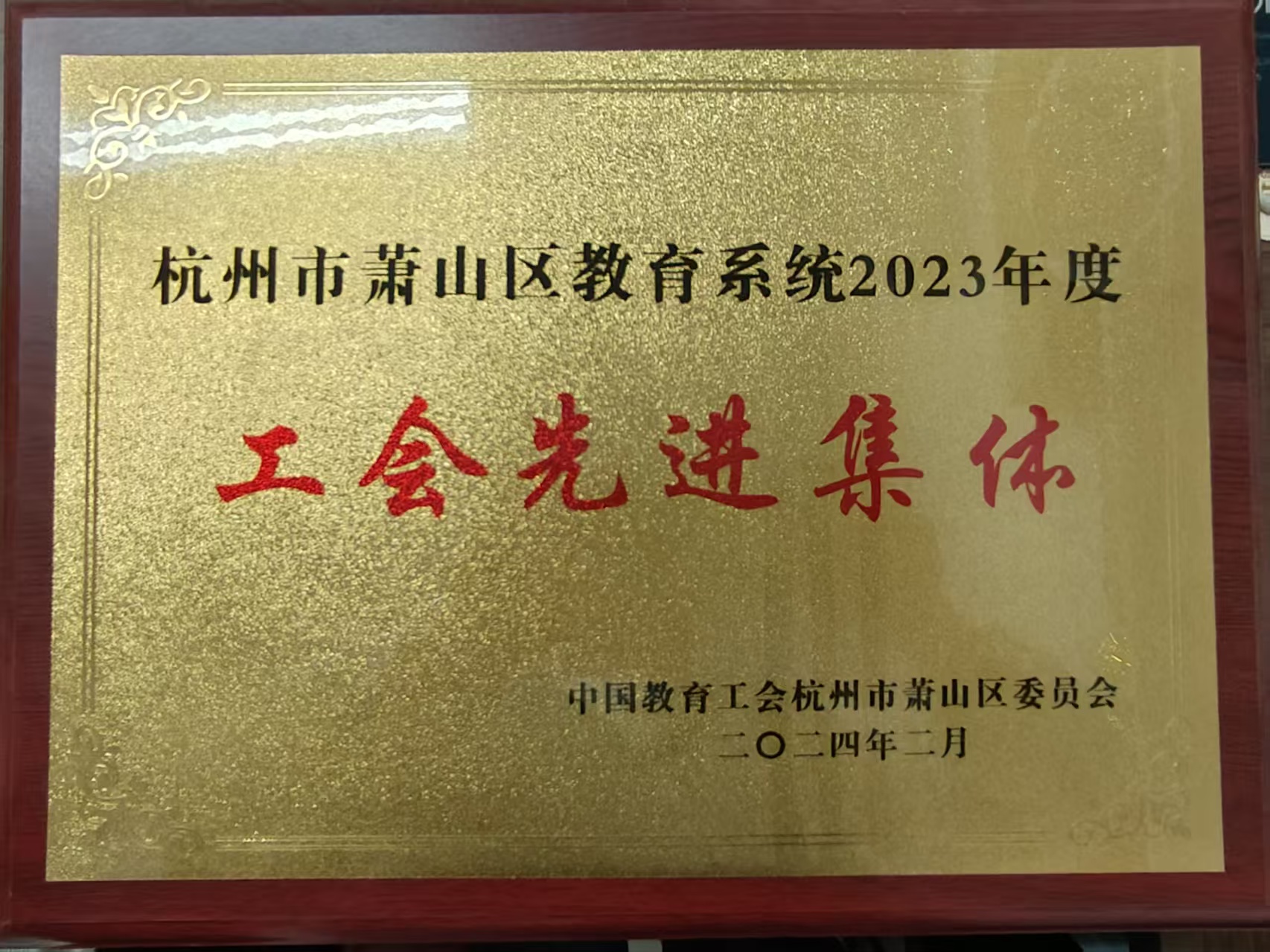 被评为杭州市萧山区教育系统2023年度工会先进集体牌匾