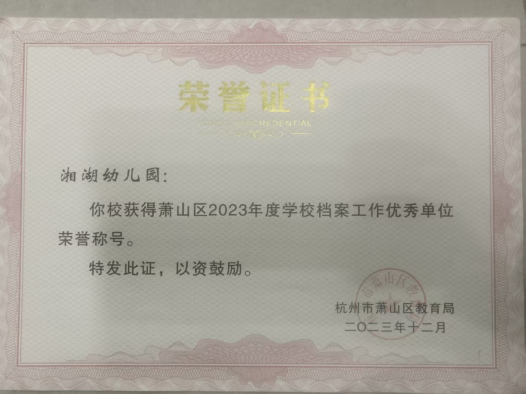 萧山区湘湖幼儿园被评为2023年度学校档案室优秀单位荣誉证书