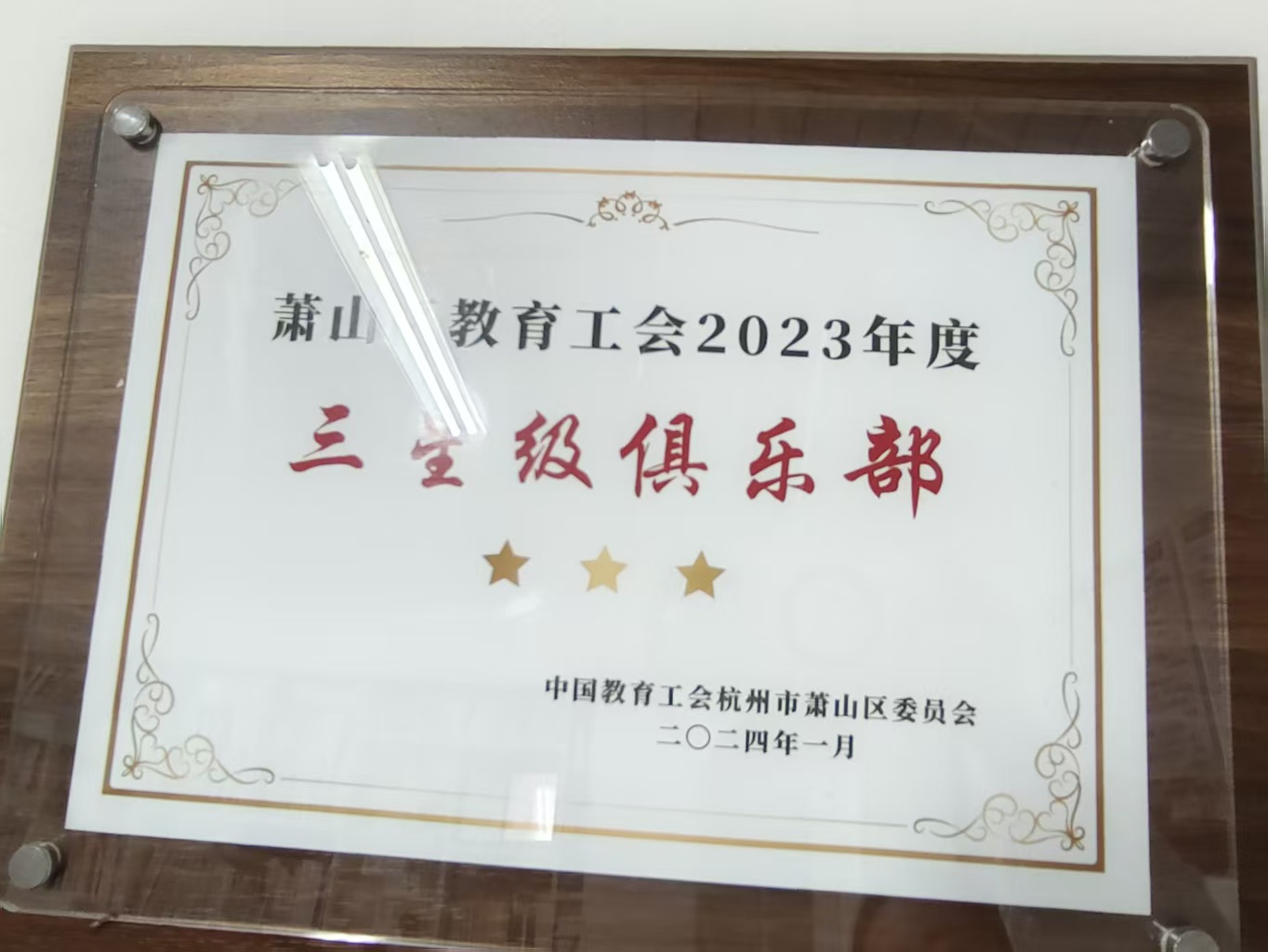 萧山区湘湖幼儿园杯评为区教育工会2023年度三星级俱乐部奖牌